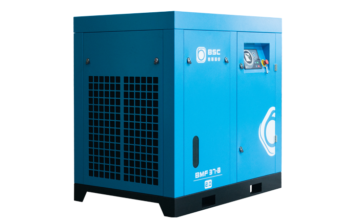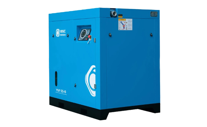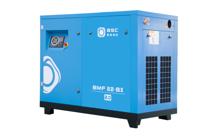 Compresor a tornillo con variador de velocidad y motor sincrónico de magnetos permanentes enfriado por aire.