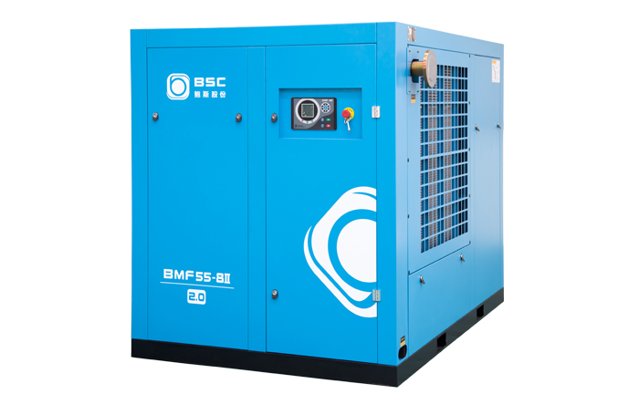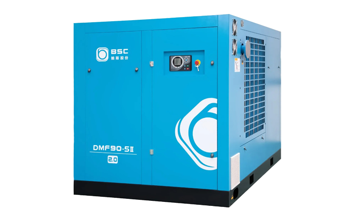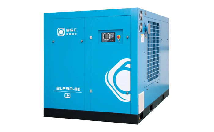 Compresor de tornillo de doble etapa con variador de velocidad y motor de magnetos permanentes enfriado por aire.