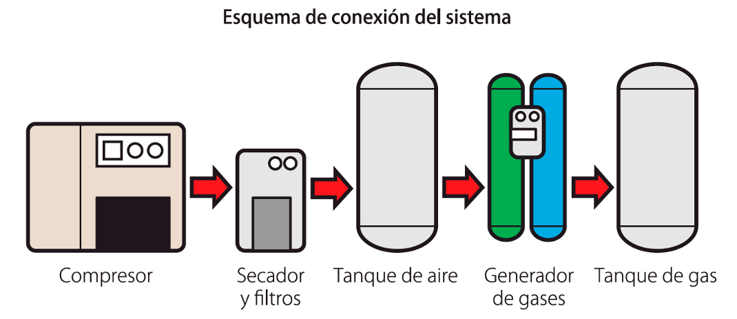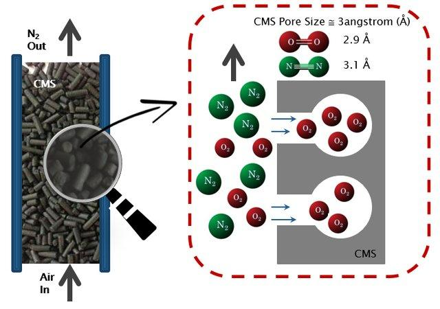 (Pressure swing adsorption), esta adsorción por balanceo de presiones en los dos tanques que conforman el generador, permite la separación molecular entre el nitrógeno y el oxígeno, permitiendo captar el oxígeno del aire comprimido en el tamiz molecular (Carbón Molecular Sieve) y el nitrógeno libre se concentra en los tanques llevando su concentración del