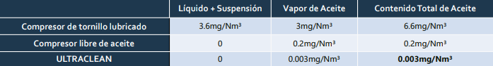 Con la implementación del ULTRACLEAN se alcanza una concentración de contenido de aceite residual en el aire comprimido inferior a 0,003mg/Nm3, alcanzando la clasificación CLASE CERO según la norma ISO8573-1. El ULTRACLEAN permite además reducir la contaminación ambiental que succiona el compresor, contaminación se pasaría si no se usa el purificador o que incluso se induciría con el uso de un compresor “libre de aceite.